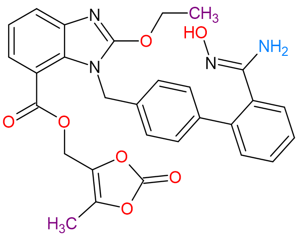 | Synonyms | Azilsartan Amidoxime; (5-Methyl-2-oxo-1,3-dioxol-4-yl)methyl 2-ethoxy-1-[[2′-(N’-hydroxycarbamimidoyl)biphenyl-4-yl]methyl]-1H-benzimidazole-7-carboxylate; (5-Methyl-2-oxo-2H-1,3-dioxol-4-yl)methyl 2-ethoxy-1-[[4-[2-(N-hydroxycarbamimidoyl)phenyl]phenyl]methyl]-1H-1,3-benzodiazole-7-carboxylate |